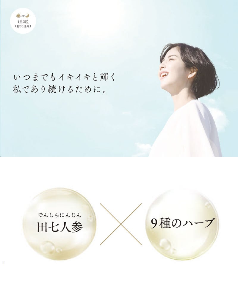 田七人参エキス、すっぽん粉末、プラセンタエキス末、9種のハーブエキス、発酵黒ニンニク、ヘム鉄など